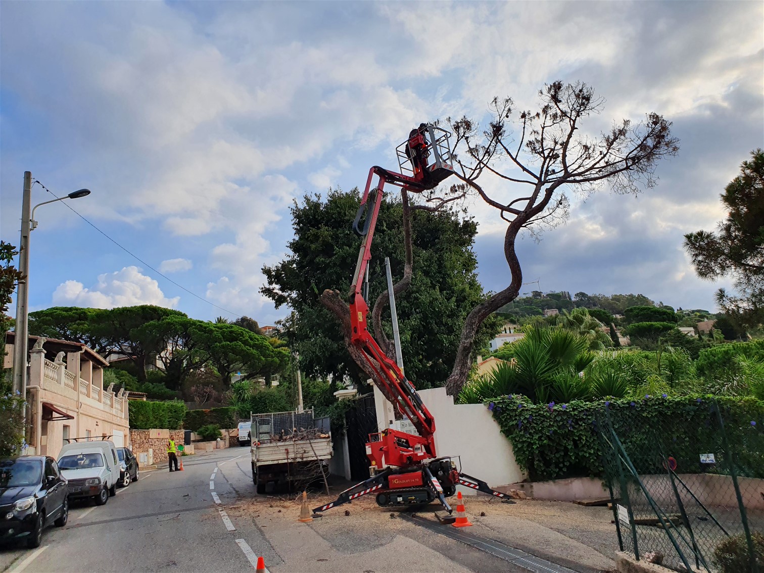 En effet le pin mort avait une branche qui dépassait sur la voie publique et de ce fait nous avons dû faire une déclaration d’occupation de la chaussée en mairie pour notre matériel et camion, il faut prévoir 3 semaines environ pour une acceptation ou refus. (Le personnel de la mairie est vraiment charmant.)
