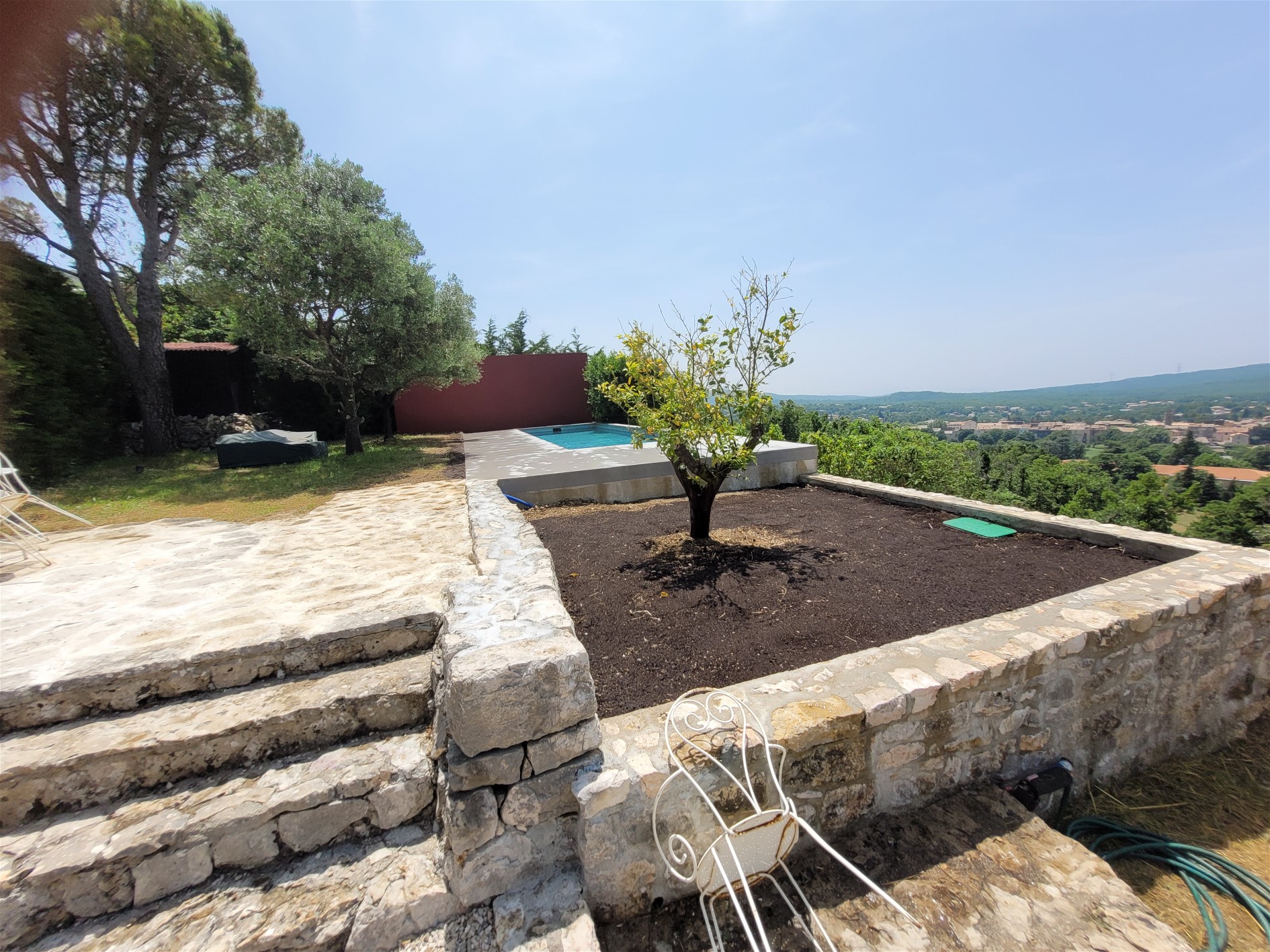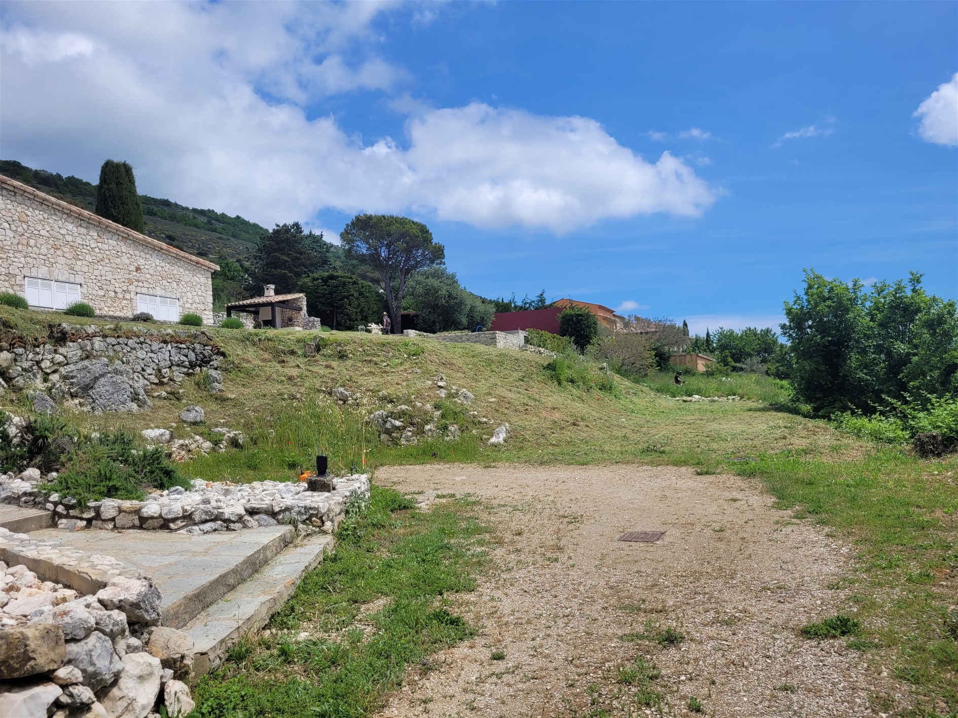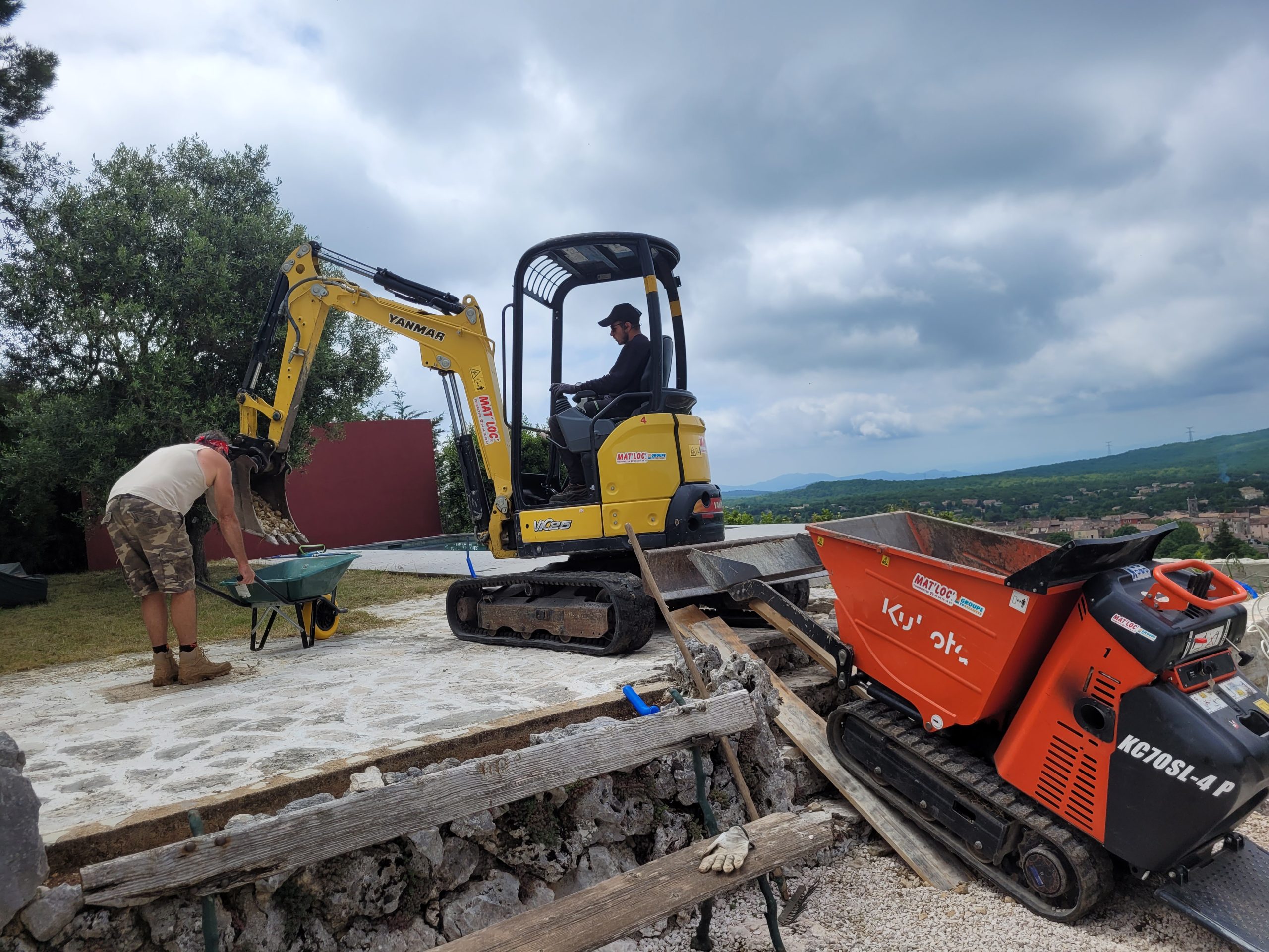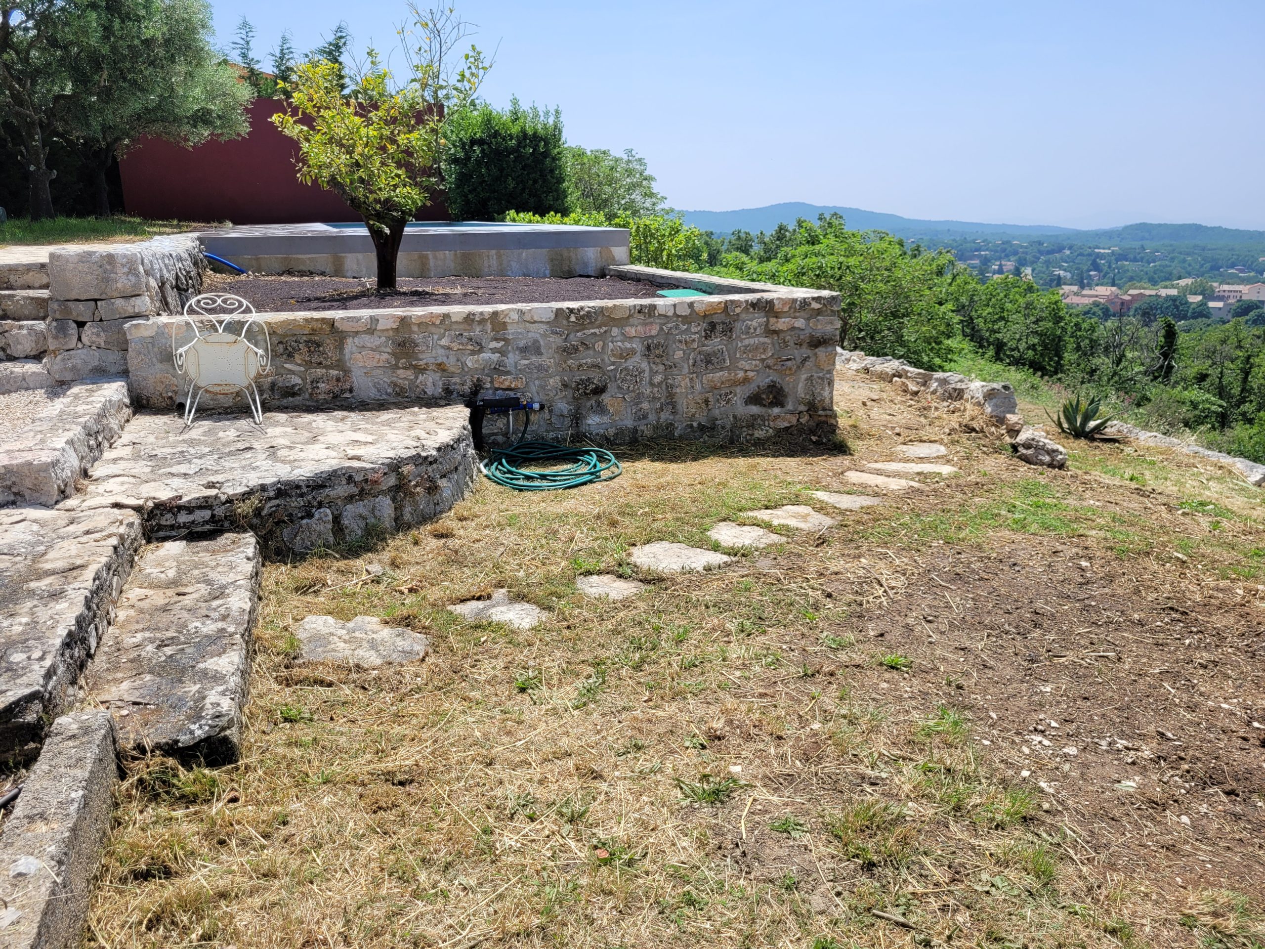 La zone d’intervention se trouvait en hauteur, sur une butte importante, avec un seul accès viable — un escalier en pierre étroit ou une montée directe, mais pentue et impraticable en brouette manuelle. Autant dire que la logistique classique n’était pas envisageable.